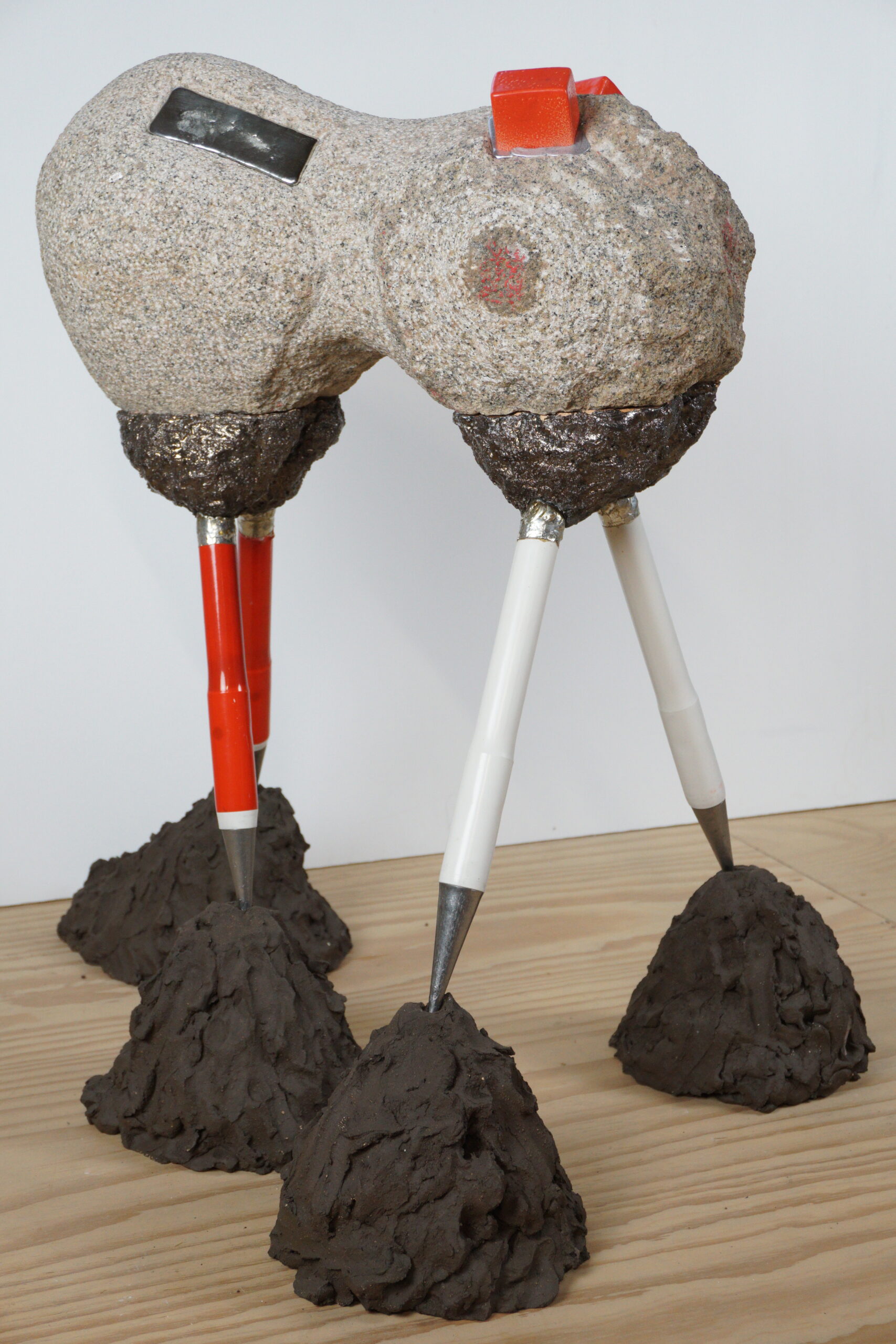 Omnia mea mecum porto. Graniet steen met ingegoten tin en keramische elementen. Poten van jalonstokken die in keramische ‘klei’ gestoken zijn.
