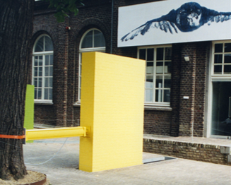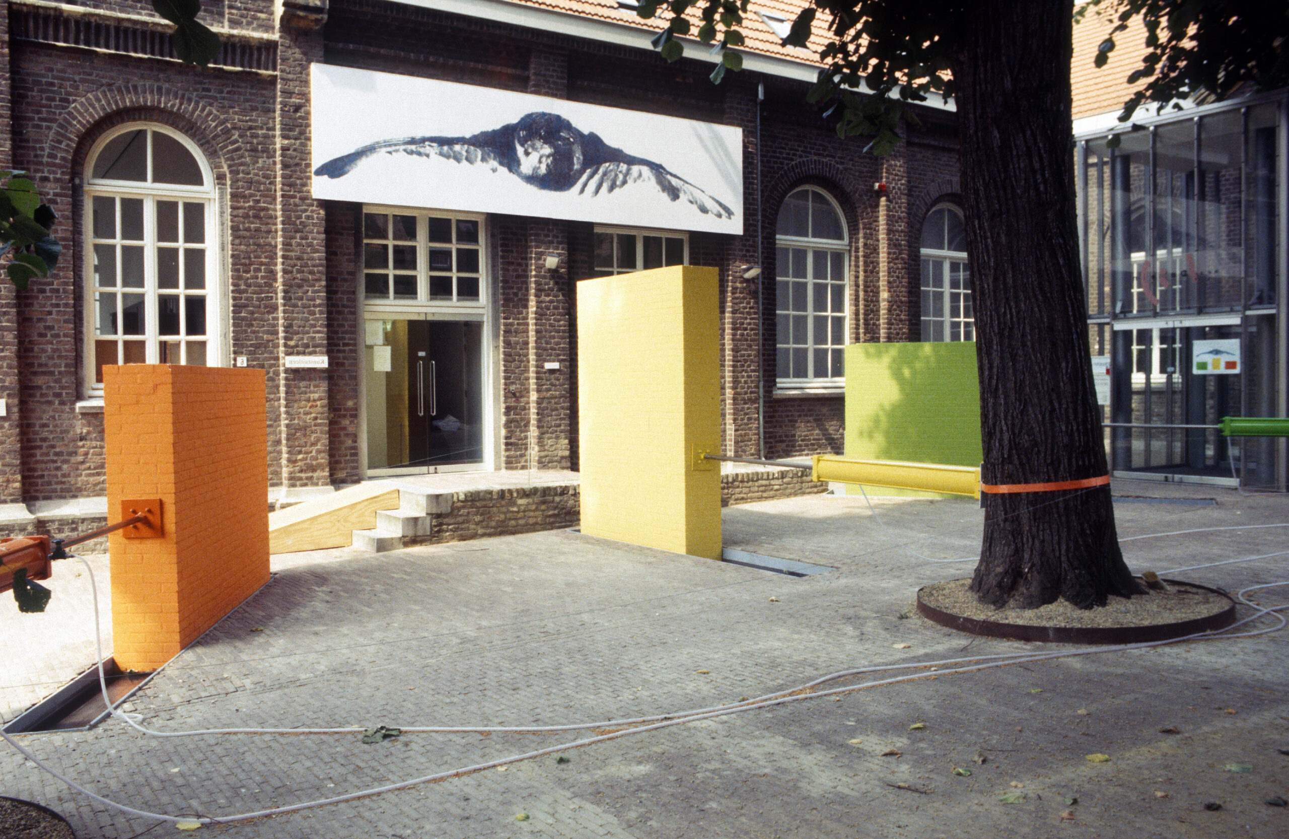 Op een binnenplaats zijn aan de drie bomen drie grote pneumatische cilinders bevestigd die drie gemetselde gekleurde muren op en neer bewegen. De muren gaan in een willekeurig patroon anderhalve meter naar voor en naar achter. Aan de wand tegenover de muren een sterk uitvergrote afbeelding van een vliegende mus (6 x 1,5 m).