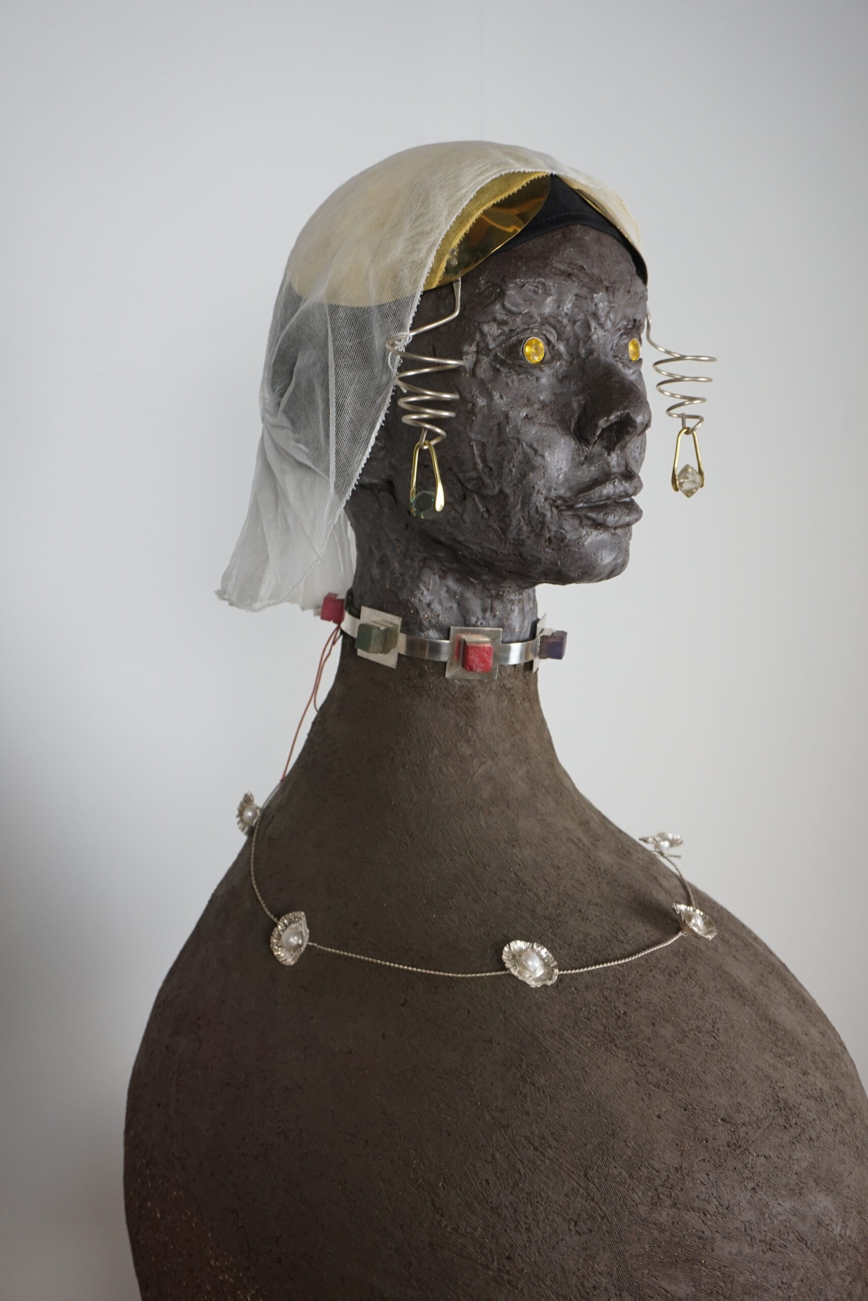 Keramische kop overlopend in een kruik geplaatst op een marmeren blok. Het geheel is geplaatst op op uitgeholde gebakken kleiblokken. De kop en kruik zijn voorzien van edelsmeedwerk van zilver, messing, edelstenen en parels. Hoofdbedekking is naar oudhollandse klederdracht.