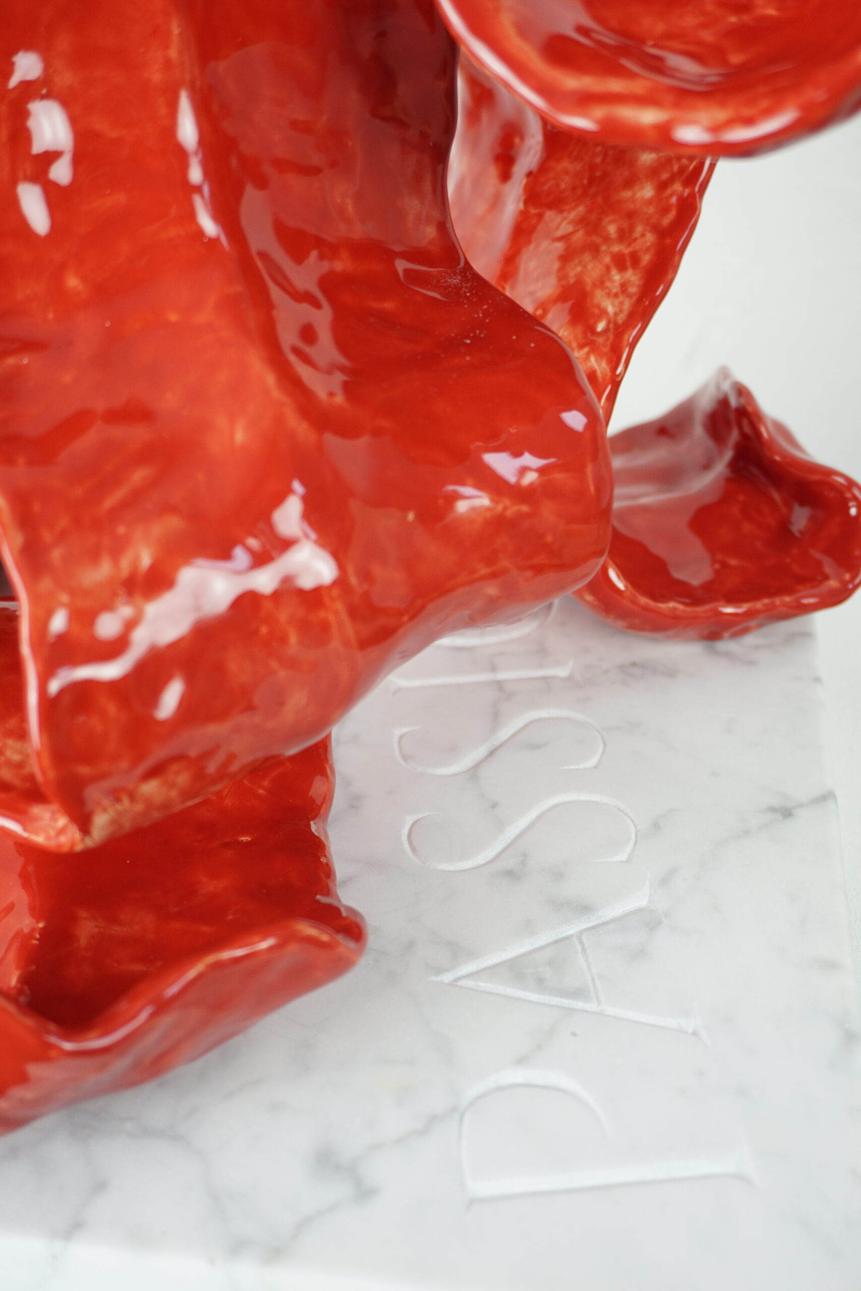 Plant uit de serie ‘La condition humaine’. Keramische plant geplaatst op een marmeren plaat met daarin de letters Passion uitgehakt.