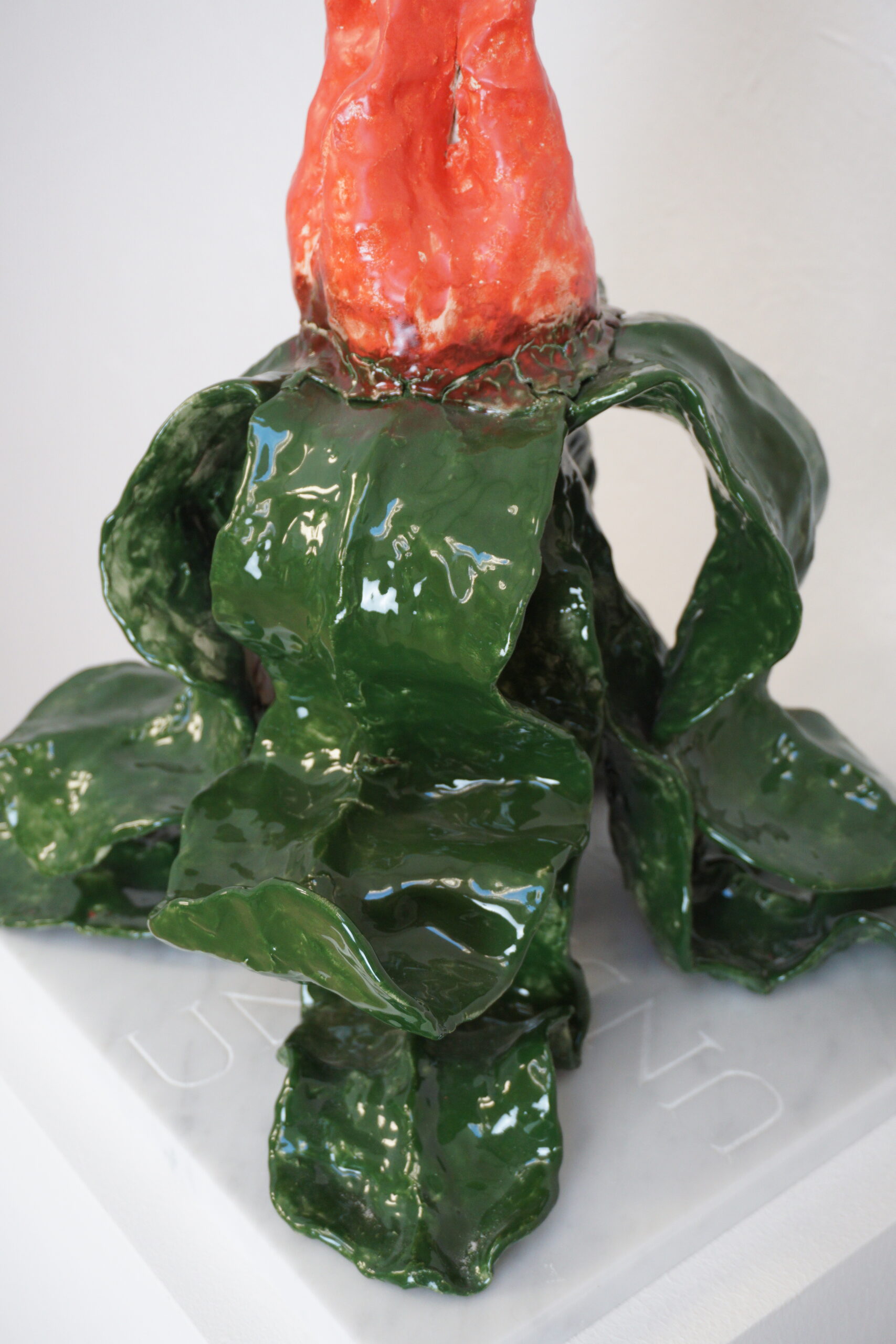 Plant uit de serie ‘La condition humaine’. Keramische plant geplaatst op een marmeren plaat met daarin de letters UNBROKEN uitgehakt.