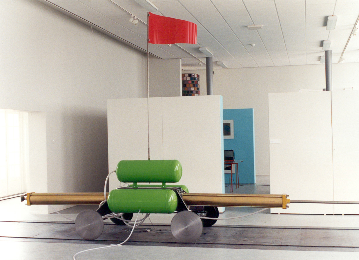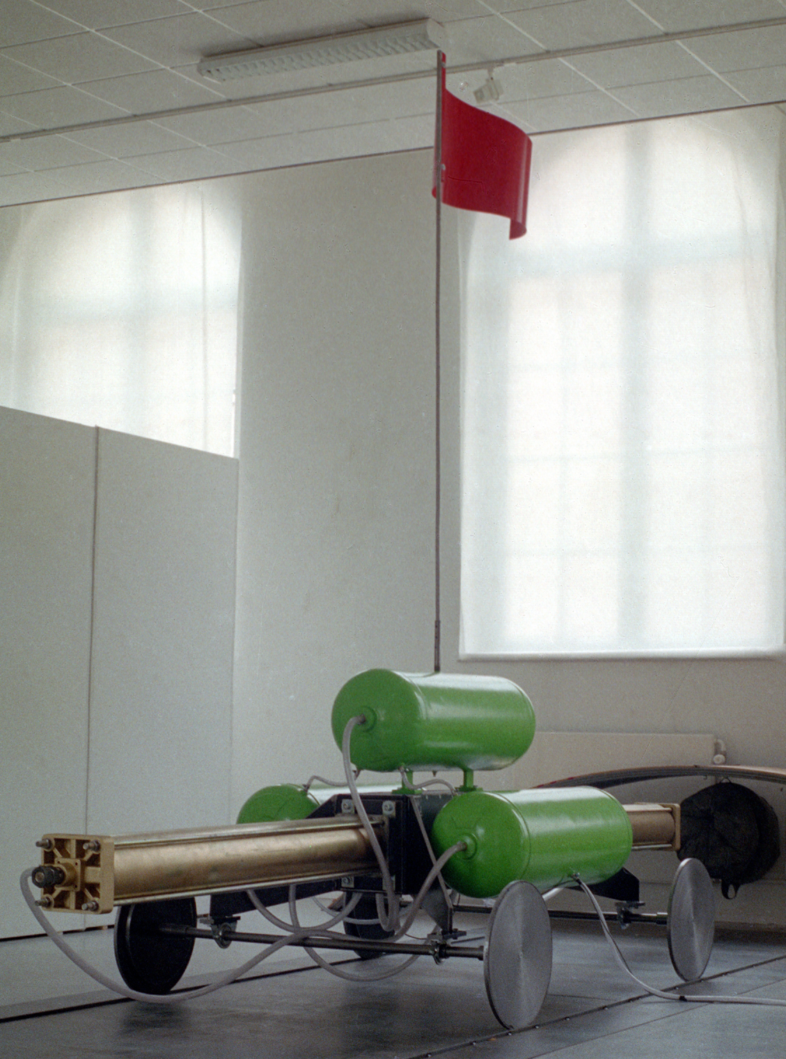 Wagen met een grote massa (+/- 600 kg) duwt zichzelf af tegen de muur met behulp van grote pneumatische cilinders. Op regelmatige tijden rijdt de wagen dwars door de zaal van muur tot muur. De pneumatische cilinders zijn geel gegalvaniseerd, drie luchtbuffertanks groen met bovenop een rode van staalplaat gewalste vlag. Langs de muren zijn loopbruggetjes voor het publiek.